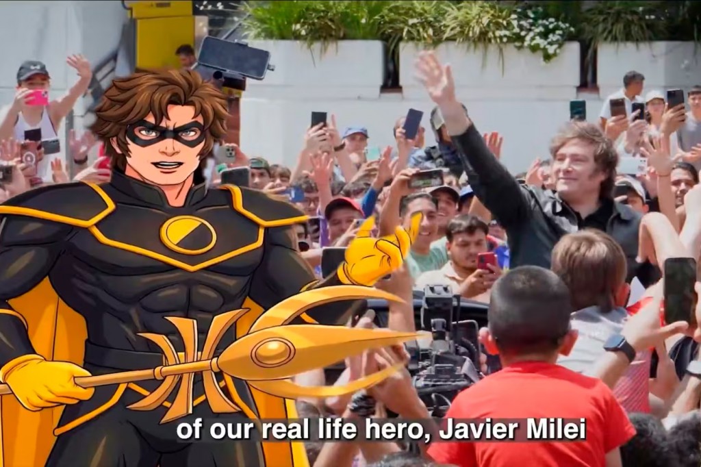 La presentación se realizó a través de un video de alto impacto visual, narrado por el General Ancap, en el que Milei es caracterizado como un “verdadero héroe” y un “peso pesado como influencer mundial”. La pieza combina imágenes de su encuentro con Donald Trump, fragmentos del acto en el Movistar Arena durante la presentación de su último libro y extractos de discursos en los que el mandatario refuerza su confrontación con los llamados “zurdos” y convoca a profundizar la denominada batalla cultural.